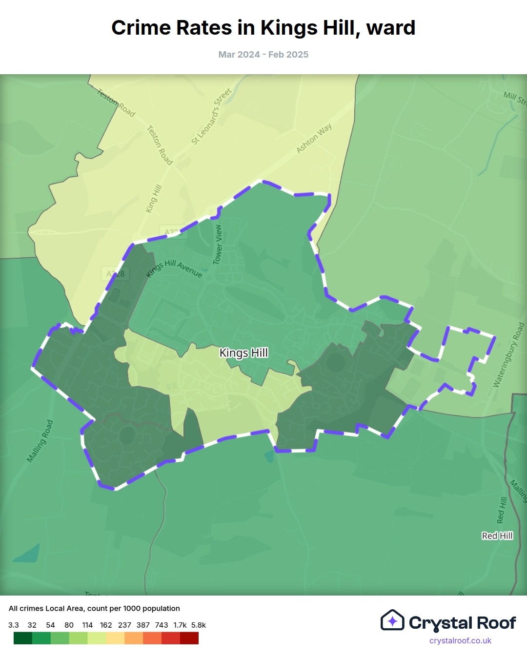 Kings Hill, (ward) includes areas with the following crime ratings (see map):