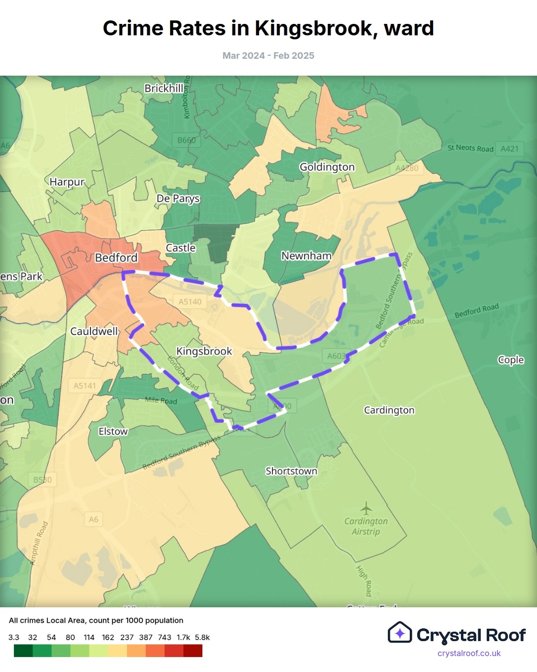 Kingsbrook (ward) is located within Bedford (borough). Annual total crime rate in Bedford (borough) is 96.2 crimes per thousand resident population, which can be rated as 4 out of 10 or low crime level compared to other local authority districts in England and Wales.