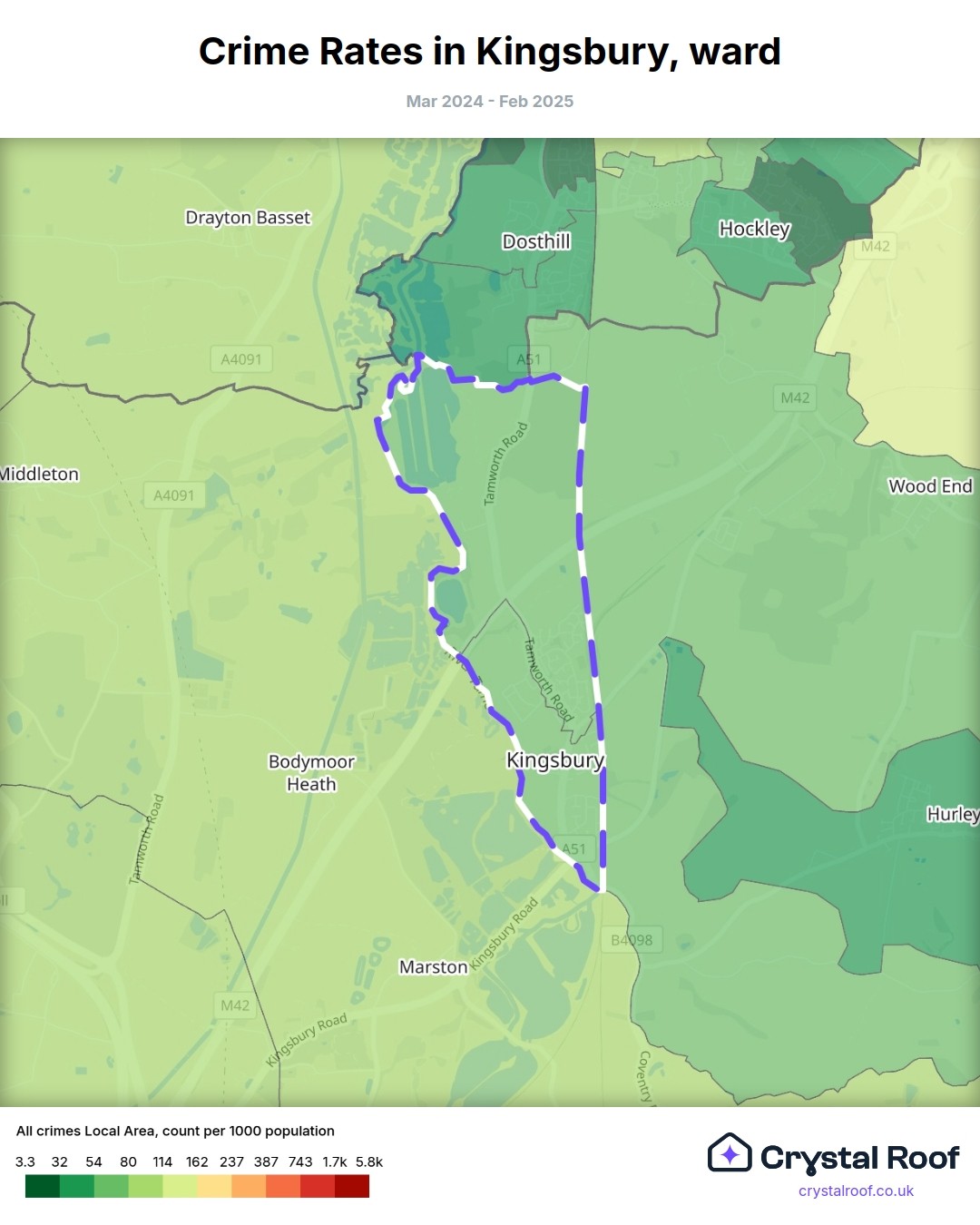 Kingsbury (ward) is located within North Warwickshire (borough). Annual total crime rate in North Warwickshire (borough) is 82.9 crimes per thousand resident population, which can be rated as 3 out of 10 or low crime level compared to other local authority districts in England and Wales.