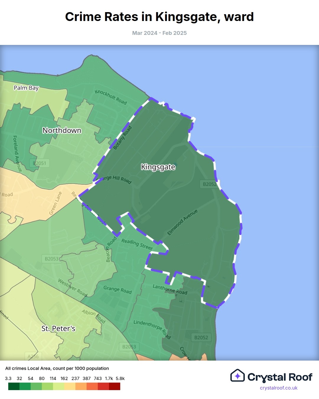 Kingsgate (ward) is located within Thanet (borough). Annual total crime rate in Thanet (borough) is 121 crimes per thousand resident population, which can be rated as 6 out of 10 or medium crime level compared to other local authority districts in England and Wales.