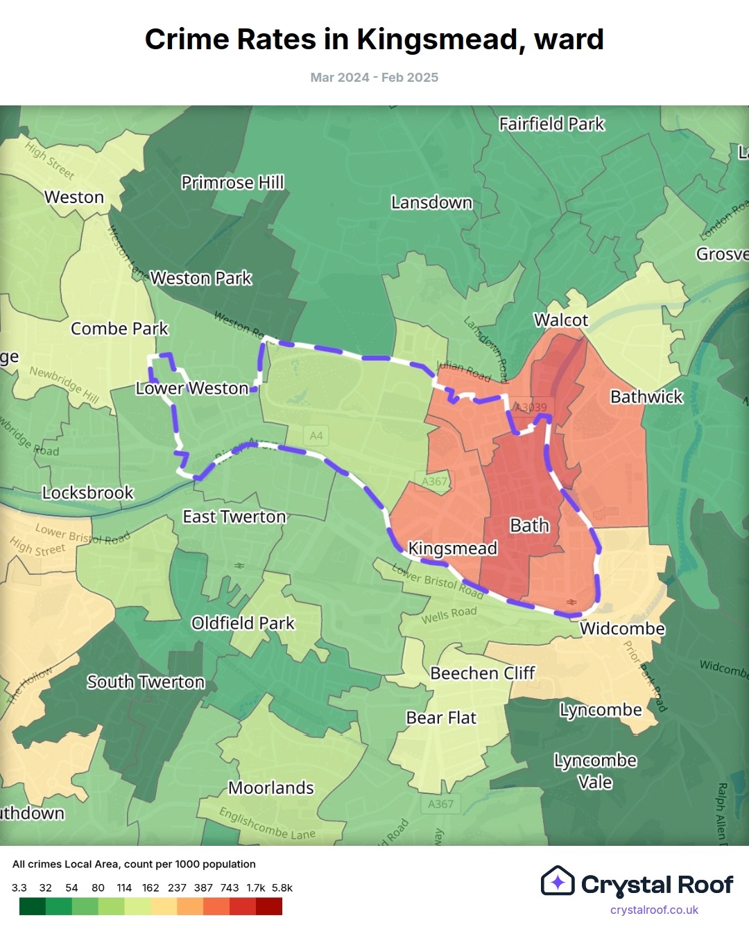 Kingsmead, (ward) includes areas with the following crime ratings (see map):
