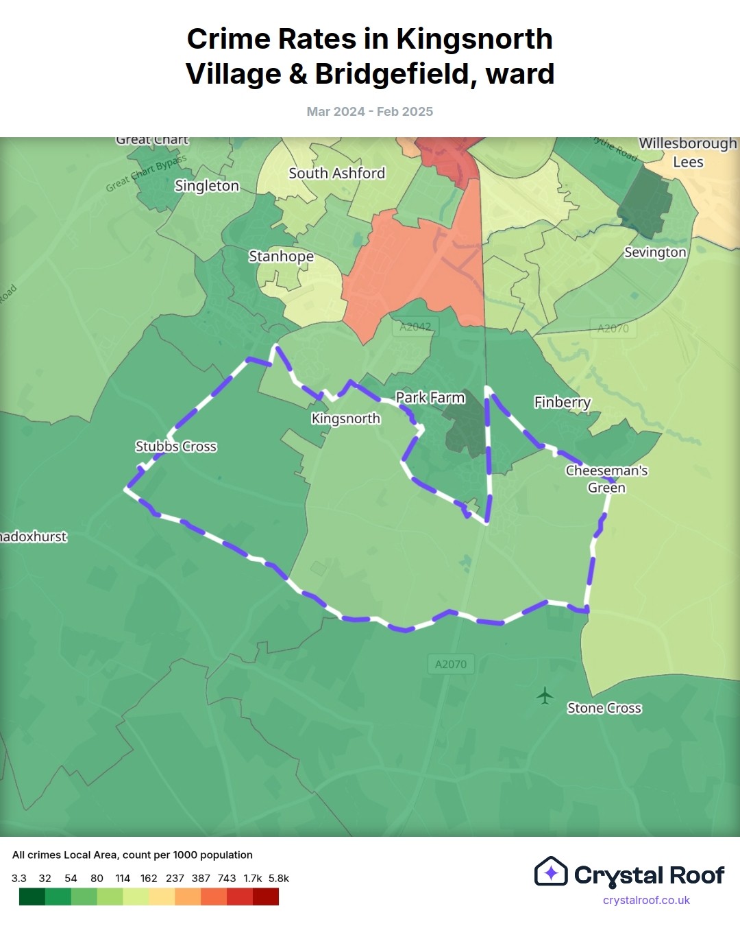 Kingsnorth Village & Bridgefield, (ward) includes areas with the following crime ratings (see map):