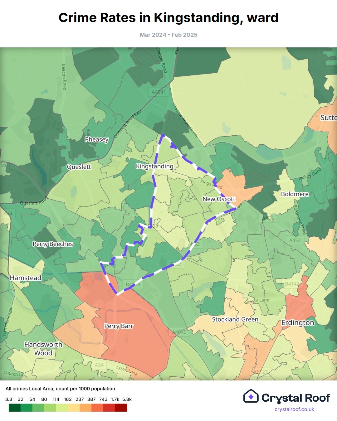 The figures in grey indicate the relative ratings of Kingstanding (ward) for a specific crime type compared to other wards in England and Wales.