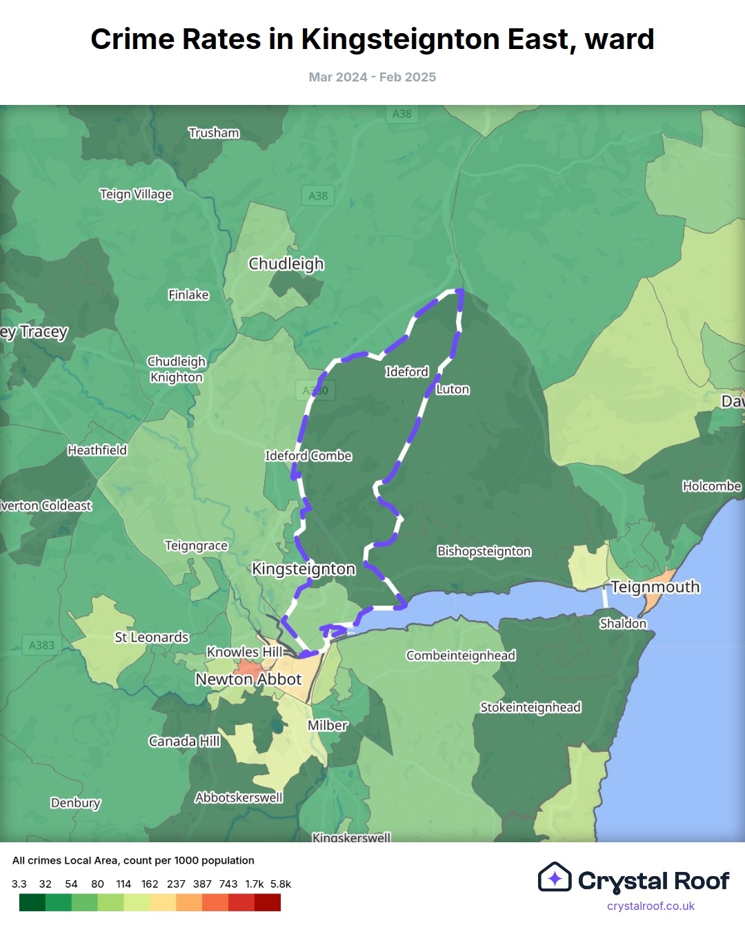 Kingsteignton East, (ward) includes areas with the following crime ratings (see map):