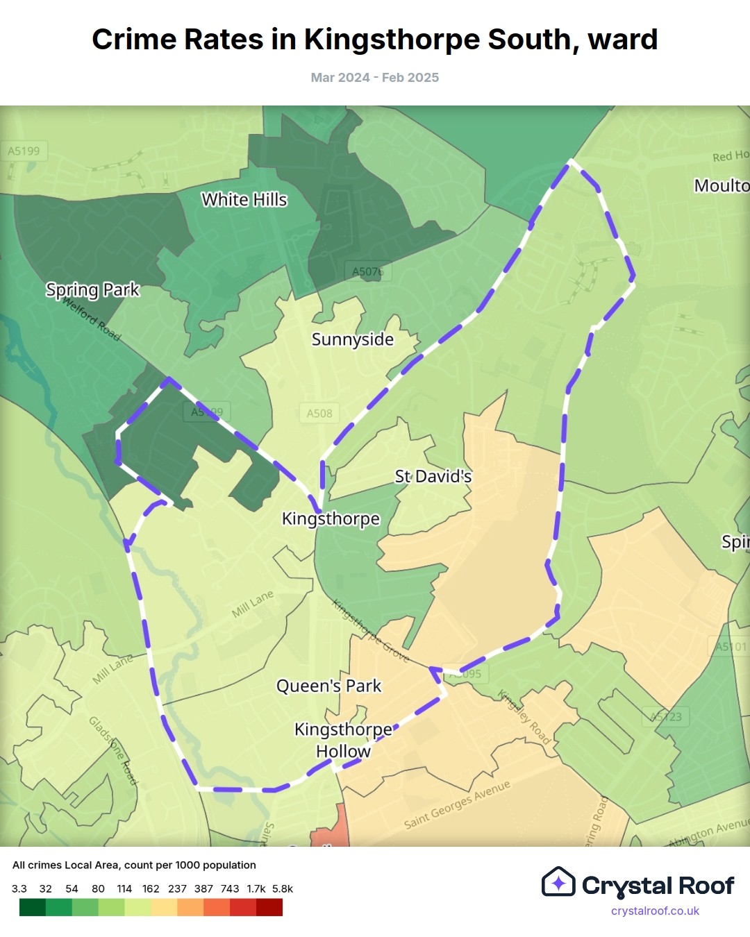 Kingsthorpe South, (ward) includes areas with the following crime ratings (see map):