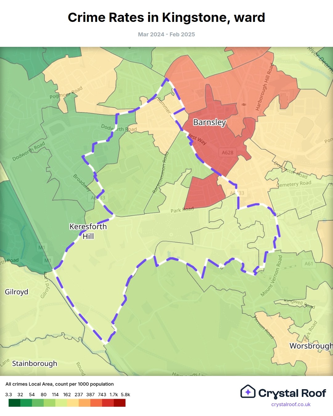 Kingstone (ward) is located within Barnsley (borough). Annual total crime rate in Barnsley (borough) is 113 crimes per thousand resident population, which can be rated as 5 out of 10 or medium crime level compared to other local authority districts in England and Wales.