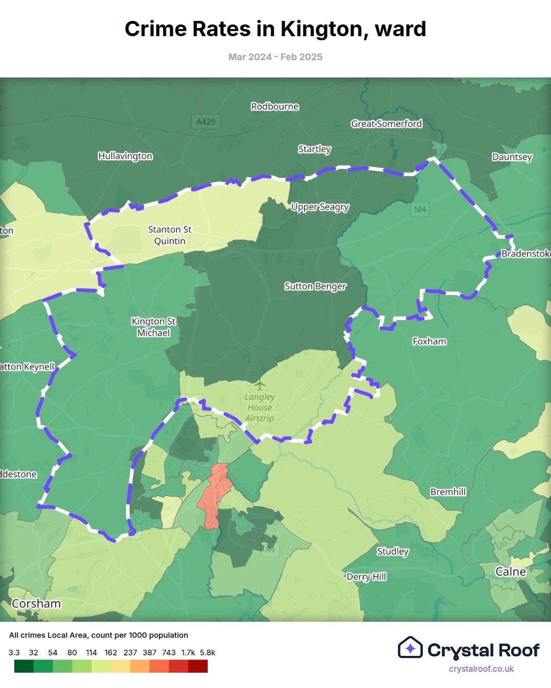 Kington (ward) is located within Wiltshire (borough). Annual total crime rate in Wiltshire (borough) is 62.1 crimes per thousand resident population, which can be rated as 2 out of 10 or low crime level compared to other local authority districts in England and Wales.