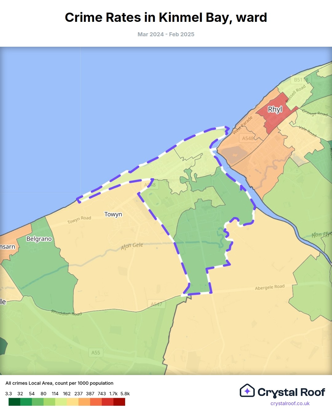Kinmel Bay, (ward) includes areas with the following crime ratings (see map):