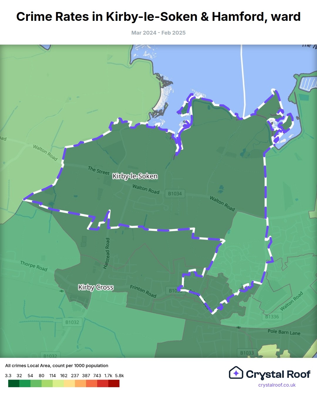 Kirby-le-Soken & Hamford, (ward) includes areas with the following crime ratings (see map):