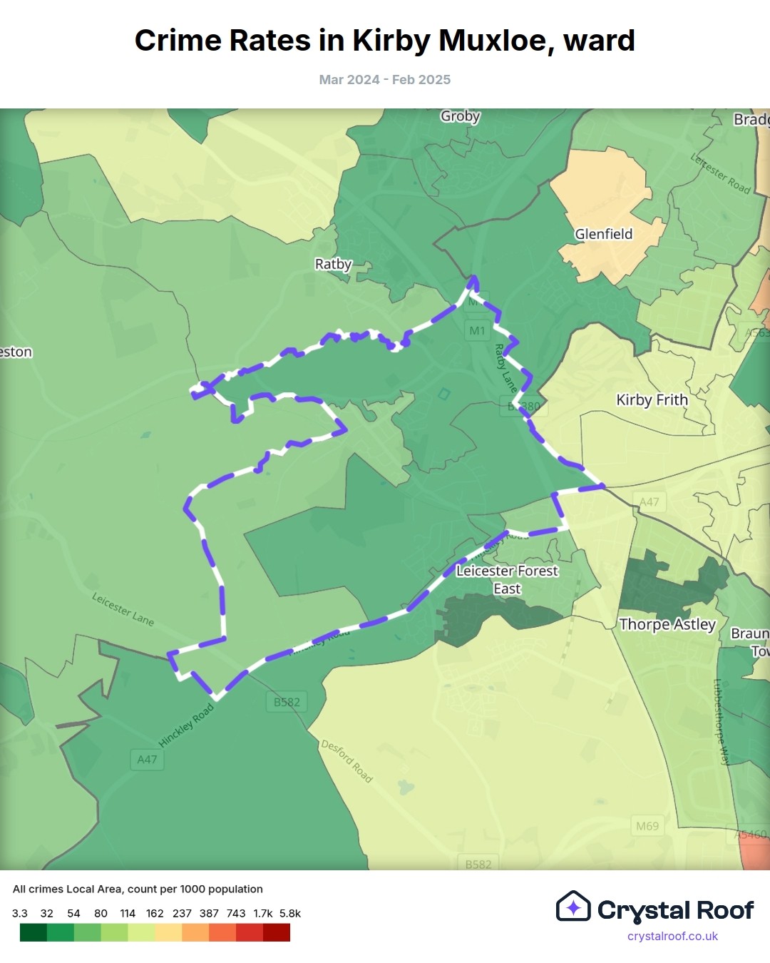 The figures in grey indicate the relative ratings of Kirby Muxloe (ward) for a specific crime type compared to other wards in England and Wales.