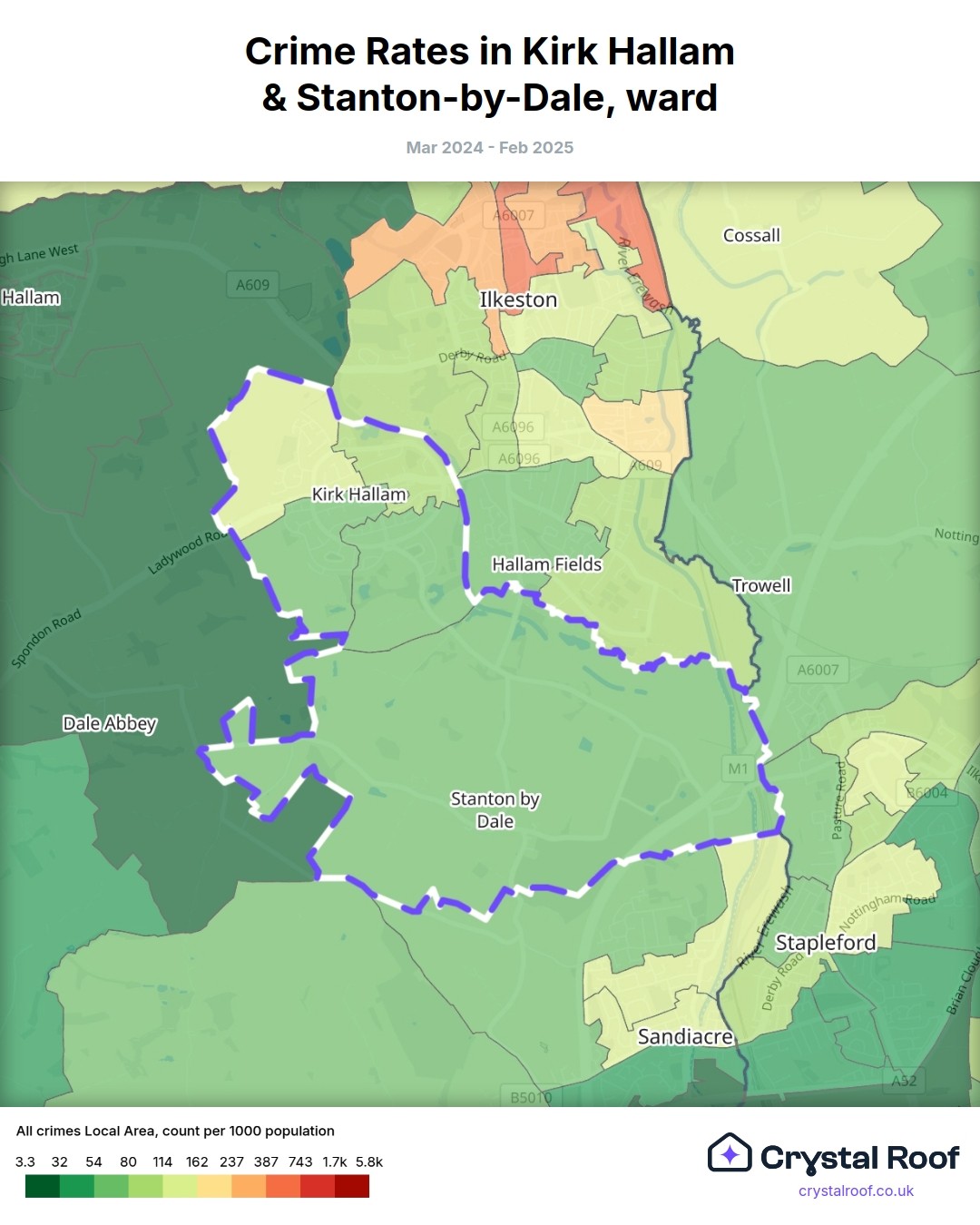 Kirk Hallam & Stanton-by-Dale, (ward) includes areas with the following crime ratings (see map):
