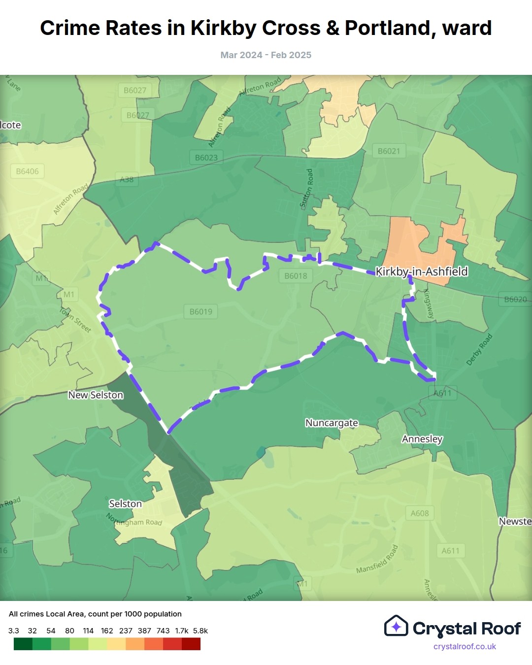Kirkby Cross & Portland (ward) is located within Ashfield (borough). Annual total crime rate in Ashfield (borough) is 98.7 crimes per thousand resident population, which can be rated as 4 out of 10 or low crime level compared to other local authority districts in England and Wales.