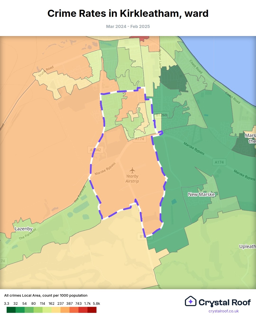 Kirkleatham, (ward) includes areas with the following crime ratings (see map):
