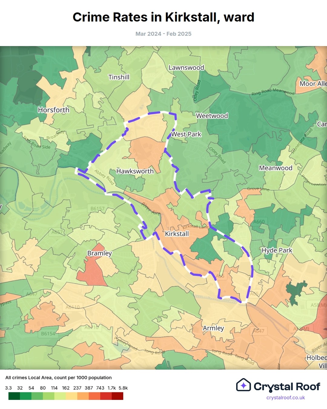 The figures in grey indicate the relative ratings of Kirkstall (ward) for a specific crime type compared to other wards in England and Wales.