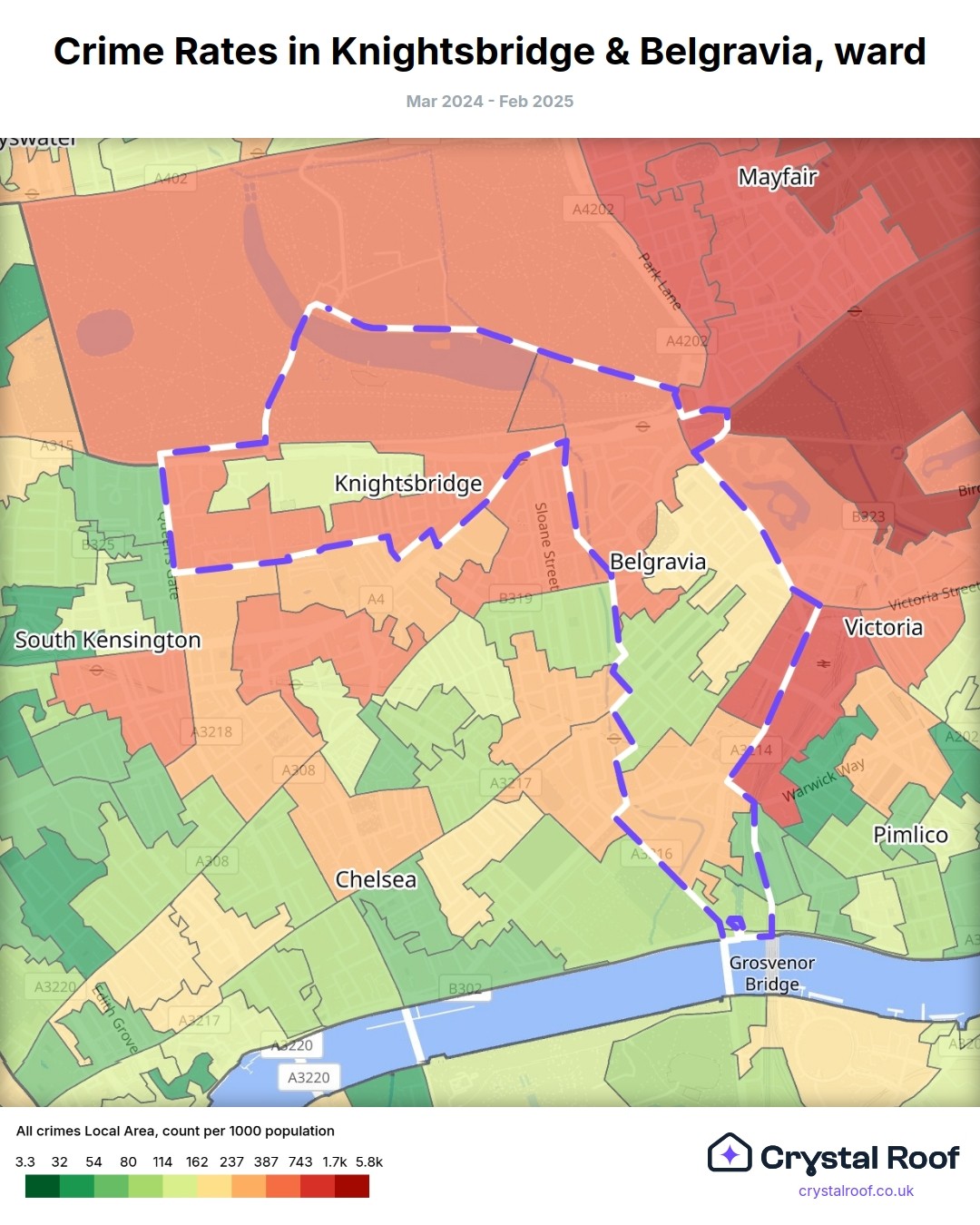 Knightsbridge & Belgravia, (ward) includes areas with the following crime ratings (see map):