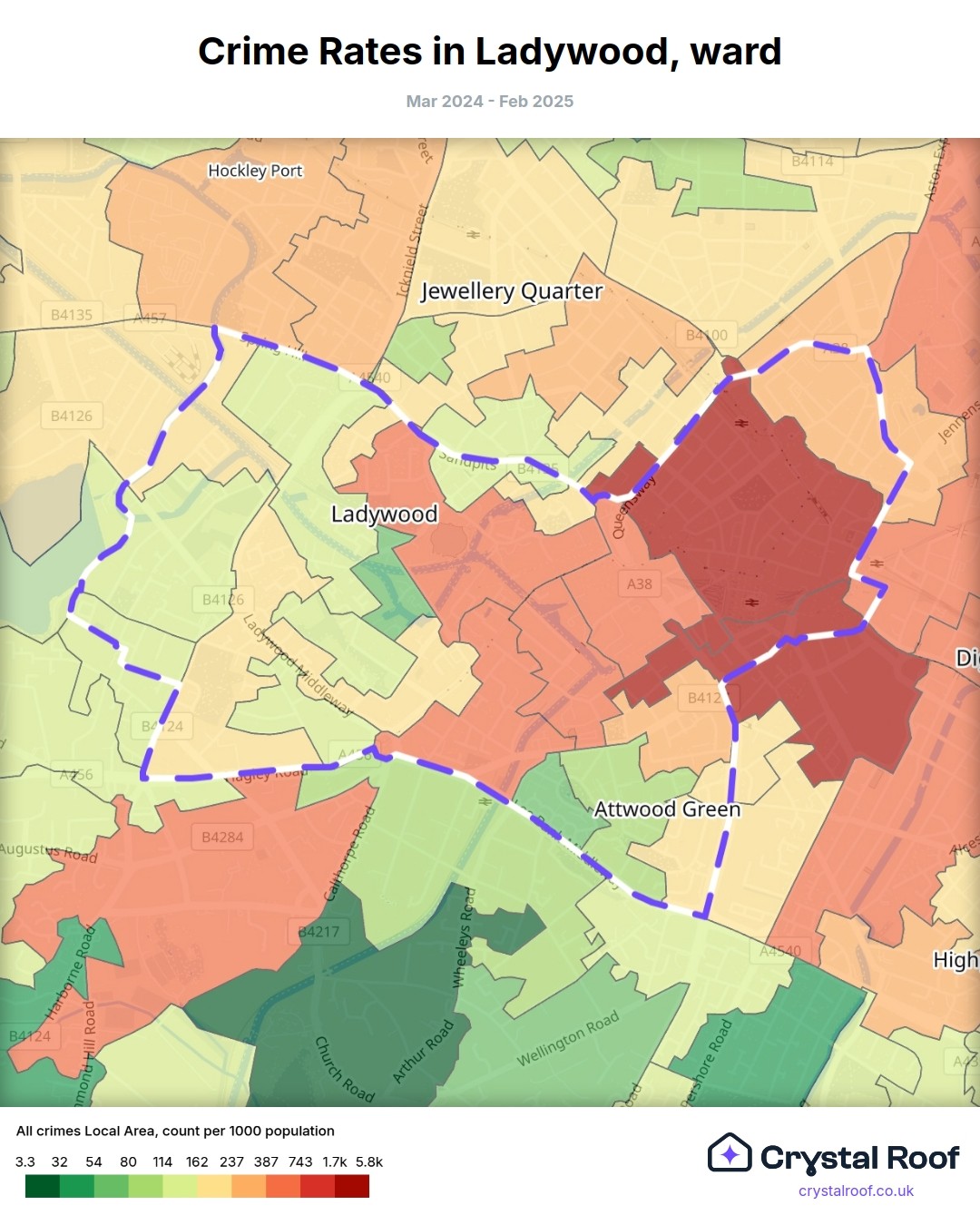 Ladywood, (ward) includes areas with the following crime ratings (see map):