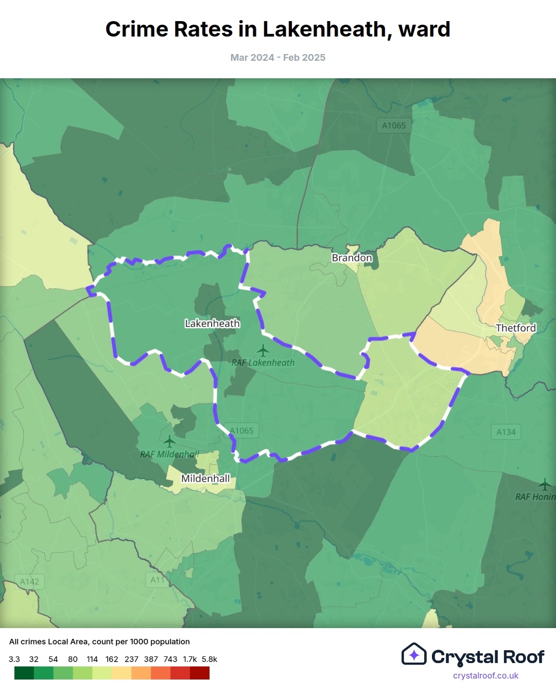 The figures in grey indicate the relative ratings of Lakenheath (ward) for a specific crime type compared to other wards in England and Wales.