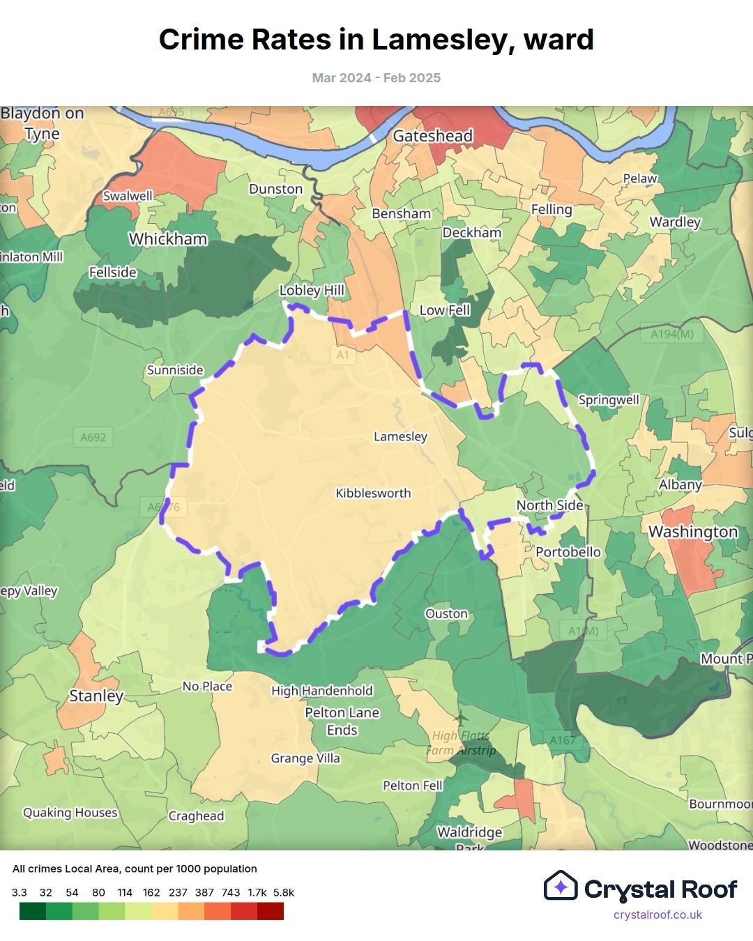 Lamesley, (ward) includes areas with the following crime ratings (see map):