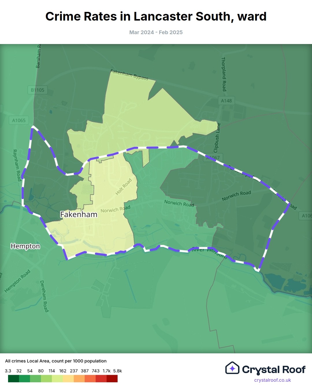 Lancaster South (ward) is located within North Norfolk (borough). Annual total crime rate in North Norfolk (borough) is 46.6 crimes per thousand resident population, which can be rated as 1 out of 10 or low crime level compared to other local authority districts in England and Wales.