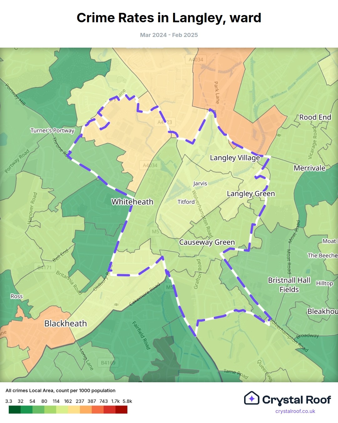 Langley (ward) is located within Sandwell (borough). Annual total crime rate in Sandwell (borough) is 107 crimes per thousand resident population, which can be rated as 5 out of 10 or medium crime level compared to other local authority districts in England and Wales.