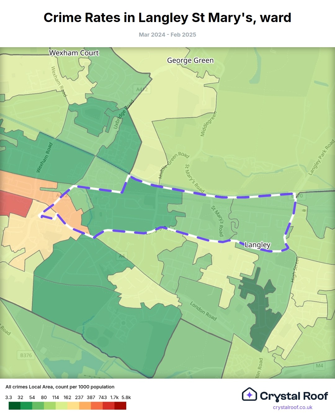 Langley St Mary's (ward) is located within Slough (borough). Annual total crime rate in Slough (borough) is 103 crimes per thousand resident population, which can be rated as 5 out of 10 or medium crime level compared to other local authority districts in England and Wales.