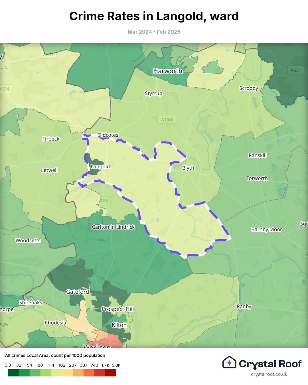 Langold, (ward) includes areas with the following crime ratings (see map):