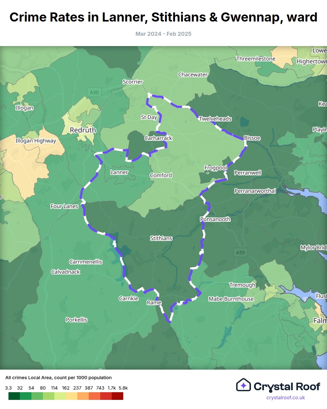 Lanner, Stithians & Gwennap, (ward) includes areas with the following crime ratings (see map):