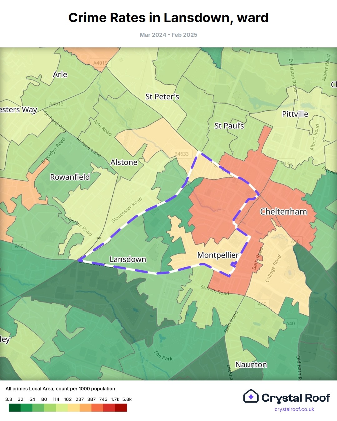 Lansdown (ward) is located within Cheltenham (borough). Annual total crime rate in Cheltenham (borough) is 107 crimes per thousand resident population, which can be rated as 5 out of 10 or medium crime level compared to other local authority districts in England and Wales.