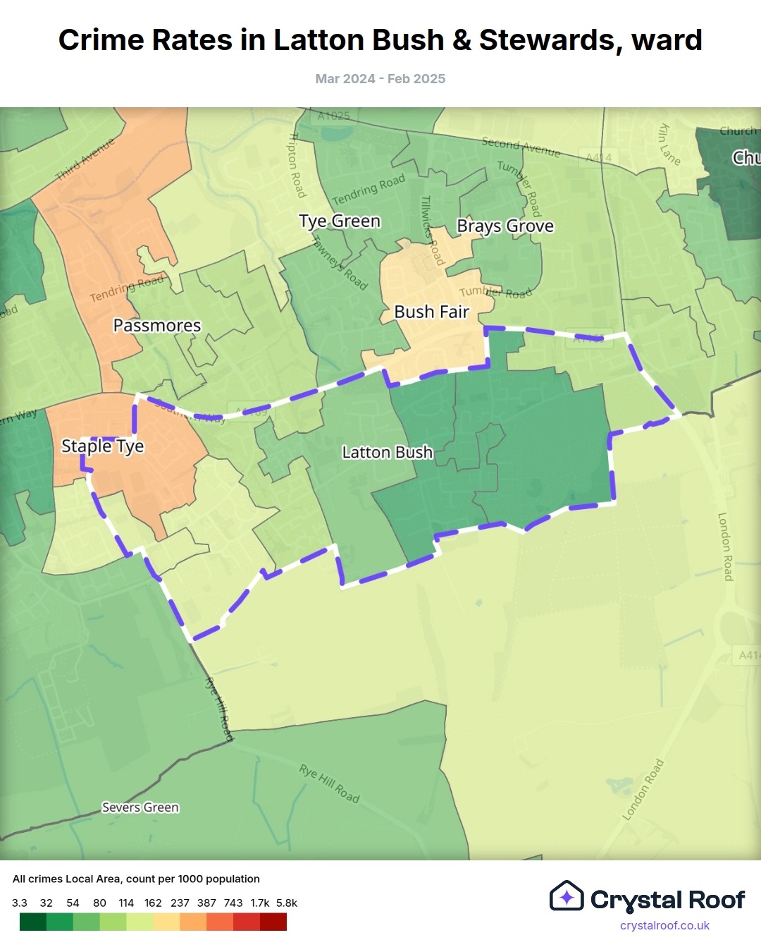 Latton Bush & Stewards, (ward) includes areas with the following crime ratings (see map):