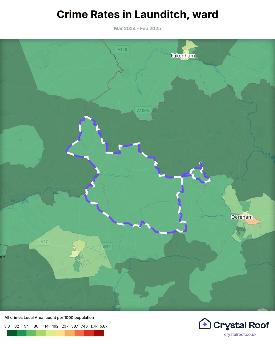 Launditch (ward) is located within Breckland (borough). Annual total crime rate in Breckland (borough) is 59.2 crimes per thousand resident population, which can be rated as 2 out of 10 or low crime level compared to other local authority districts in England and Wales.