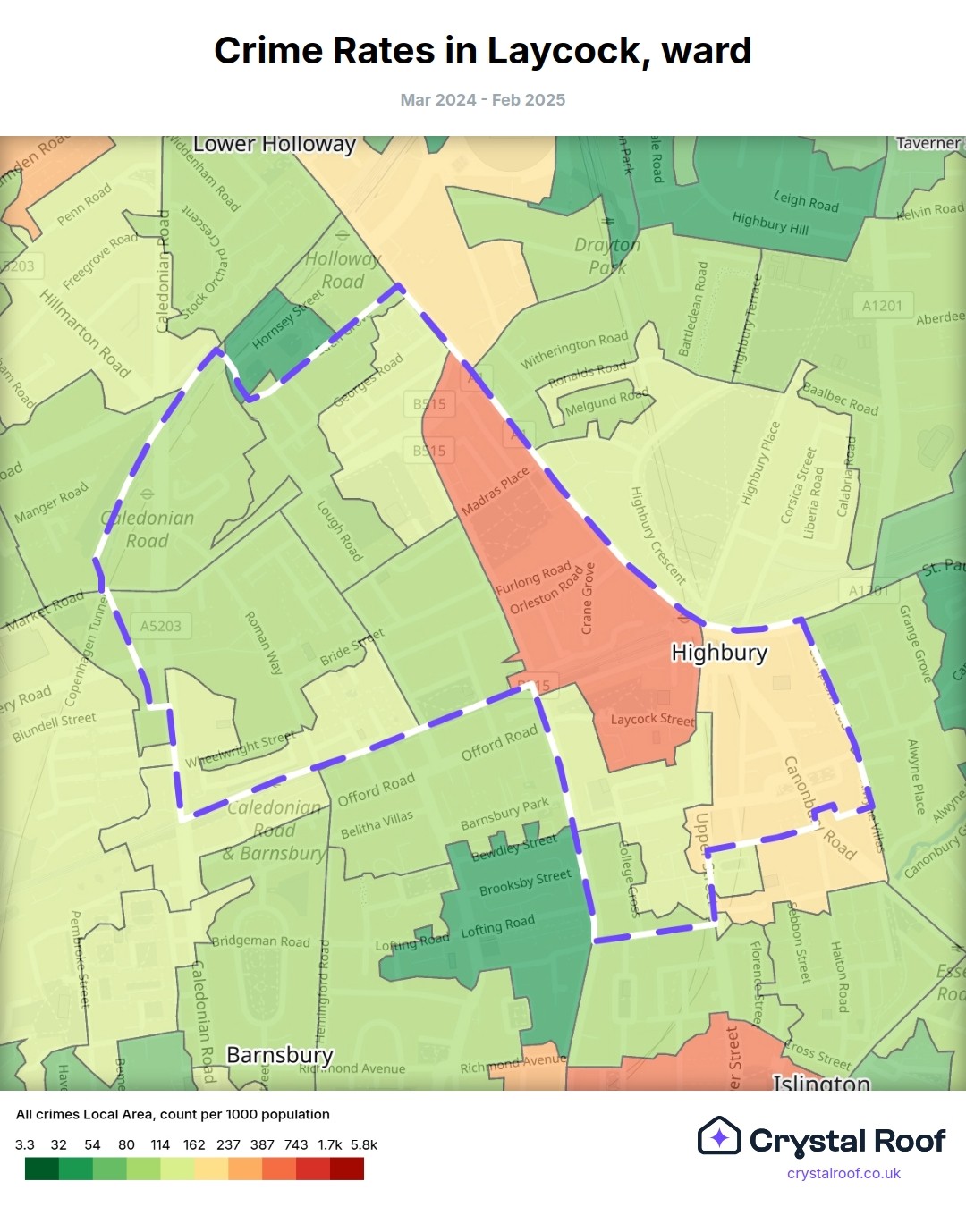 Laycock (ward) is located within Islington (borough). Annual total crime rate in Islington (borough) is 190 crimes per thousand resident population, which can be rated as 8 out of 10 or high crime level compared to other local authority districts in England and Wales.