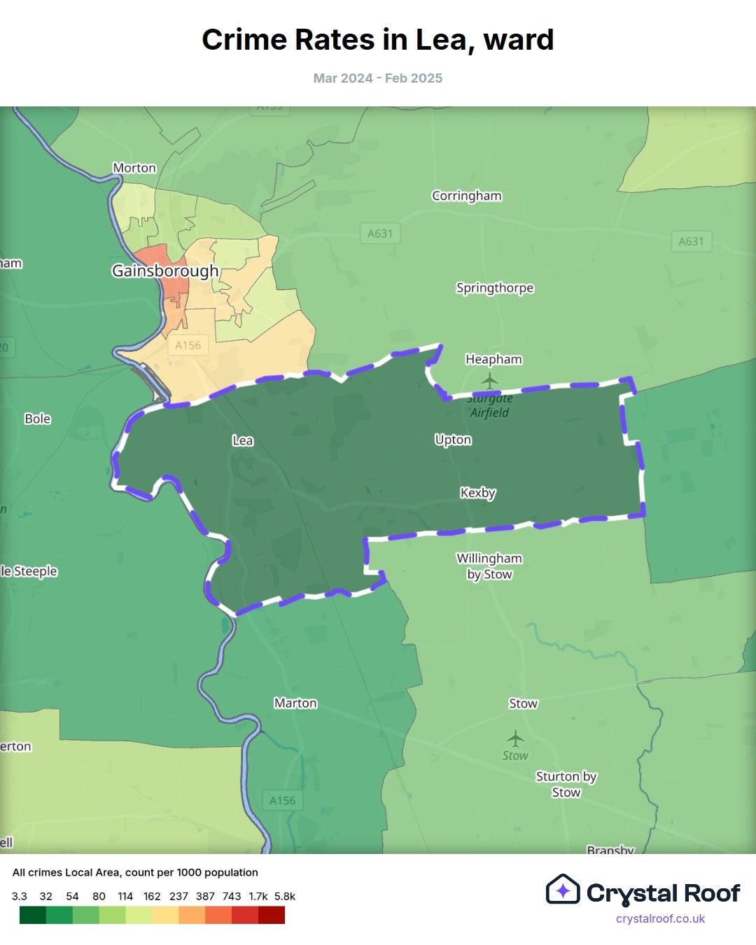 Lea (ward) is located within West Lindsey (borough). Annual total crime rate in West Lindsey (borough) is 85.1 crimes per thousand resident population, which can be rated as 3 out of 10 or low crime level compared to other local authority districts in England and Wales.