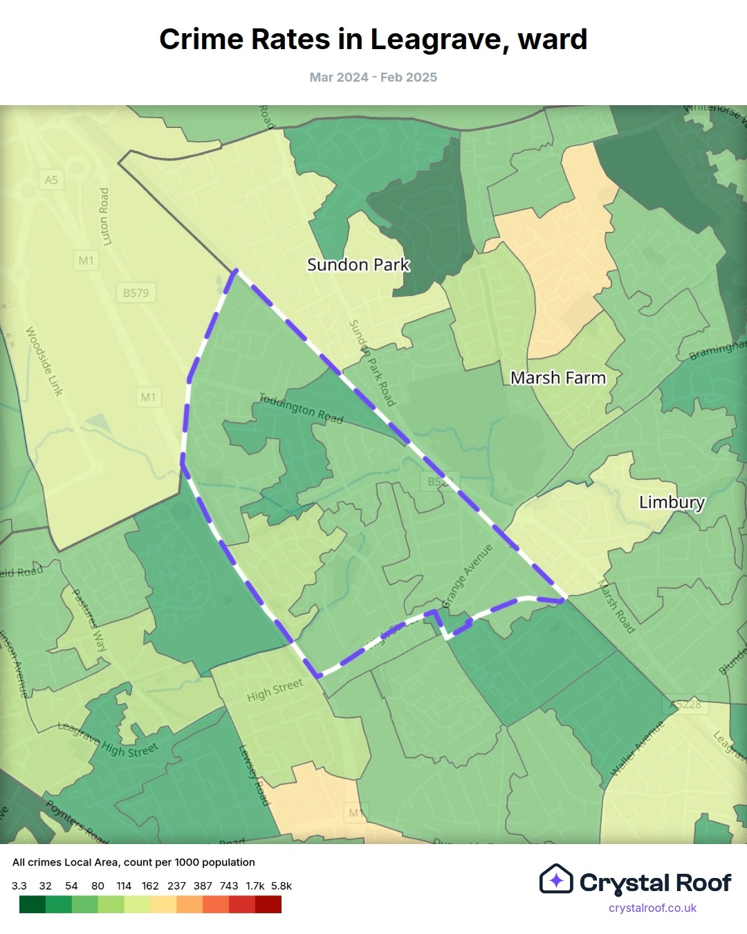 The figures in grey indicate the relative ratings of Leagrave (ward) for a specific crime type compared to other wards in England and Wales.