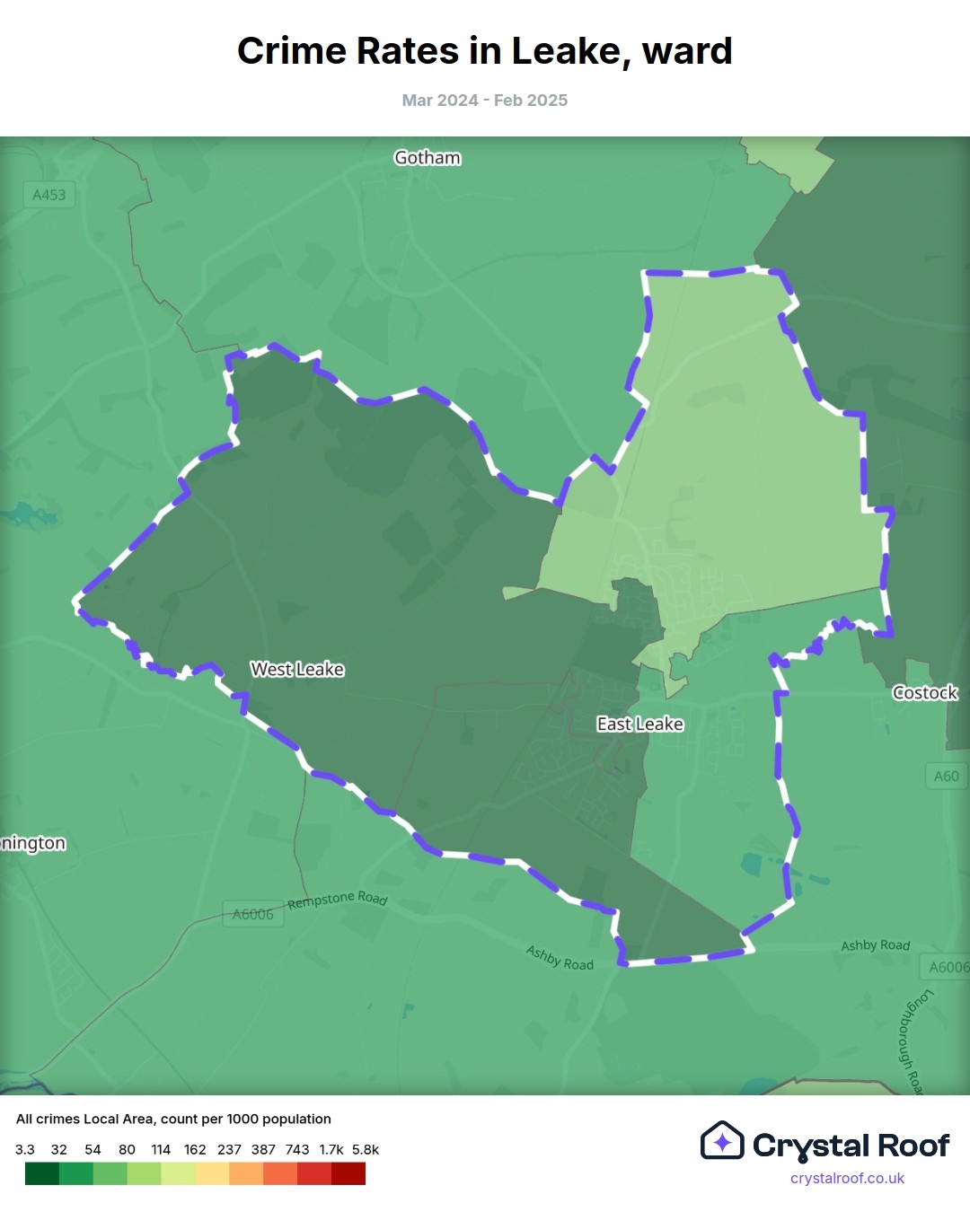 Leake (ward) is located within Rushcliffe (borough). Annual total crime rate in Rushcliffe (borough) is 52.6 crimes per thousand resident population, which can be rated as 1 out of 10 or low crime level compared to other local authority districts in England and Wales.
