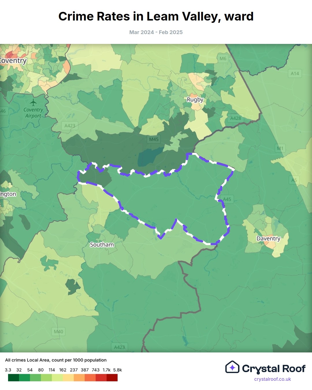 Leam Valley, (ward) includes areas with the following crime ratings (see map):