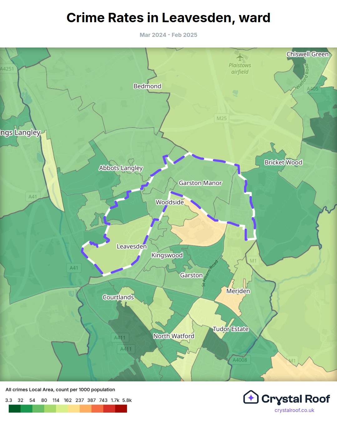 Leavesden, (ward) includes areas with the following crime ratings (see map):