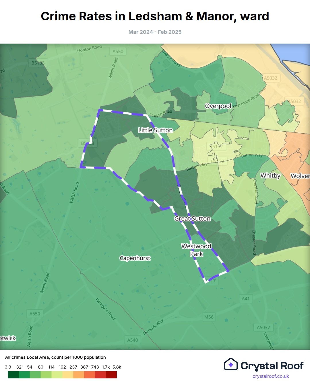 Ledsham & Manor, (ward) includes areas with the following crime ratings (see map):