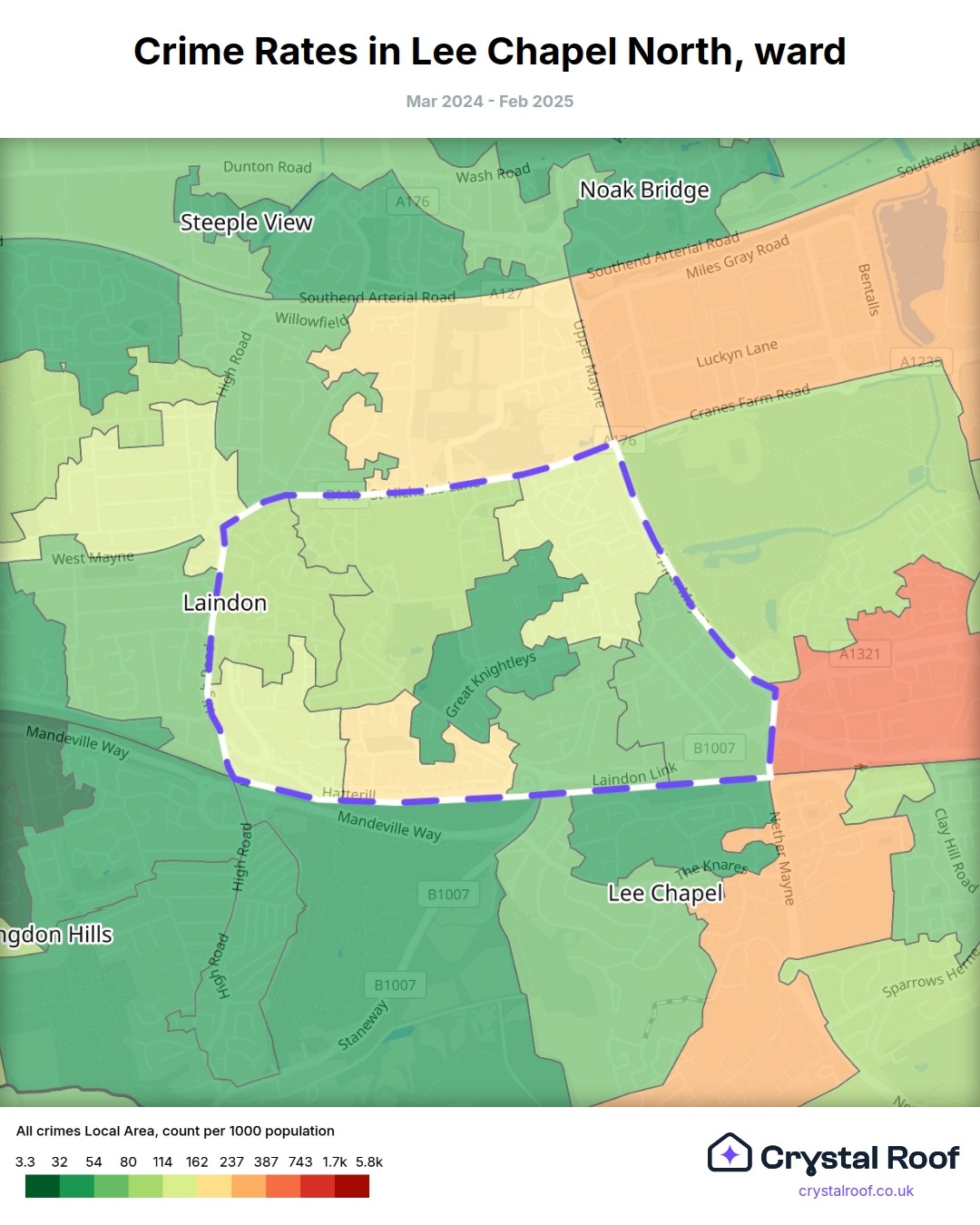 The figures in grey indicate the relative ratings of Lee Chapel North (ward) for a specific crime type compared to other wards in England and Wales.