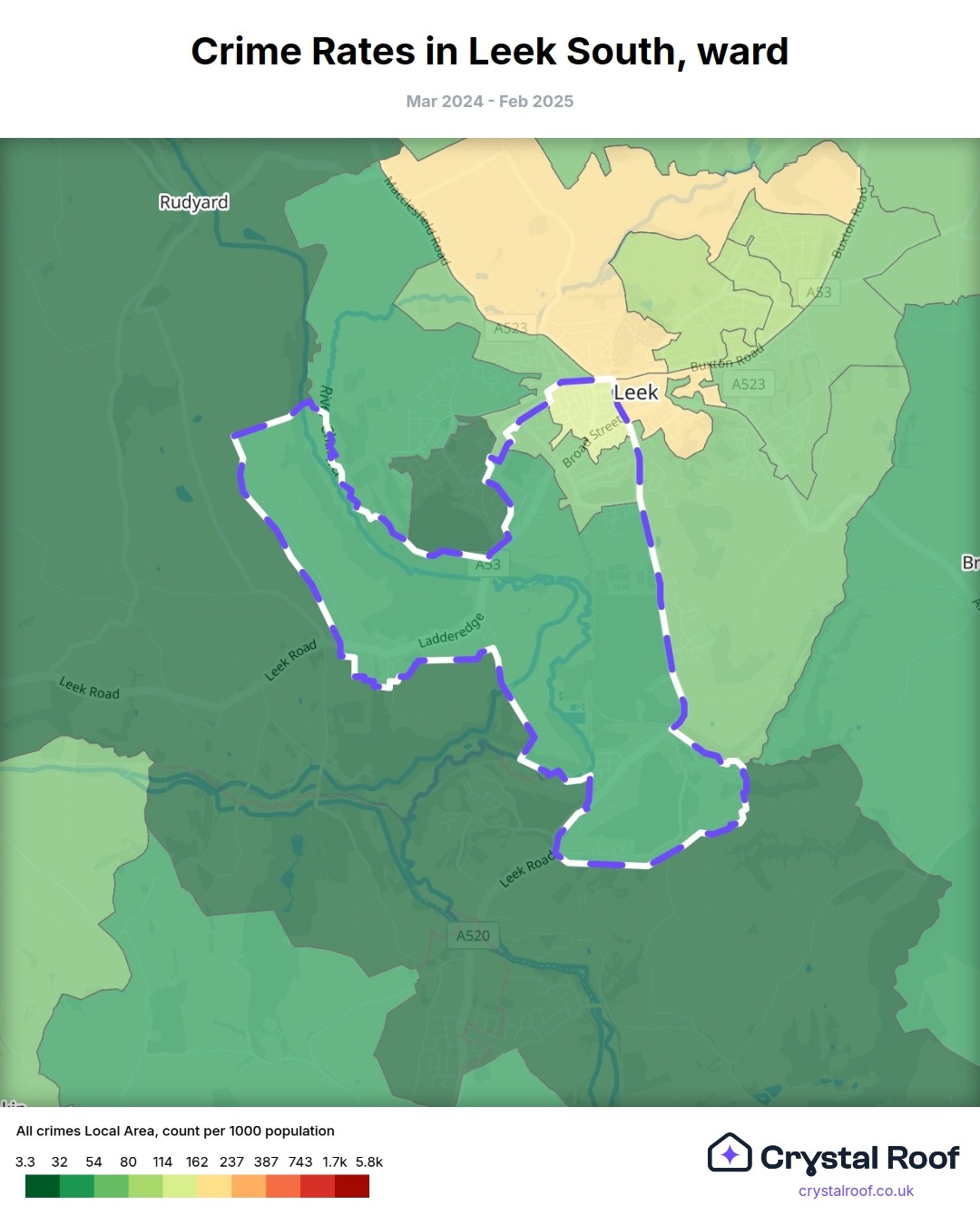 Leek South (ward) is located within Staffordshire Moorlands (borough). Annual total crime rate in Staffordshire Moorlands (borough) is 67.1 crimes per thousand resident population, which can be rated as 2 out of 10 or low crime level compared to other local authority districts in England and Wales.