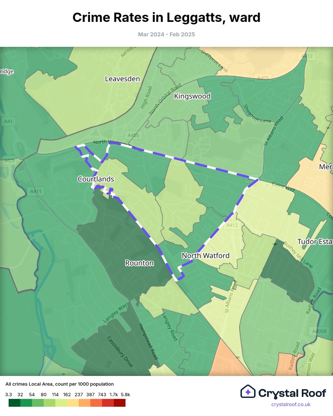 Leggatts (ward) is located within Watford (borough). Annual total crime rate in Watford (borough) is 113 crimes per thousand resident population, which can be rated as 5 out of 10 or medium crime level compared to other local authority districts in England and Wales.