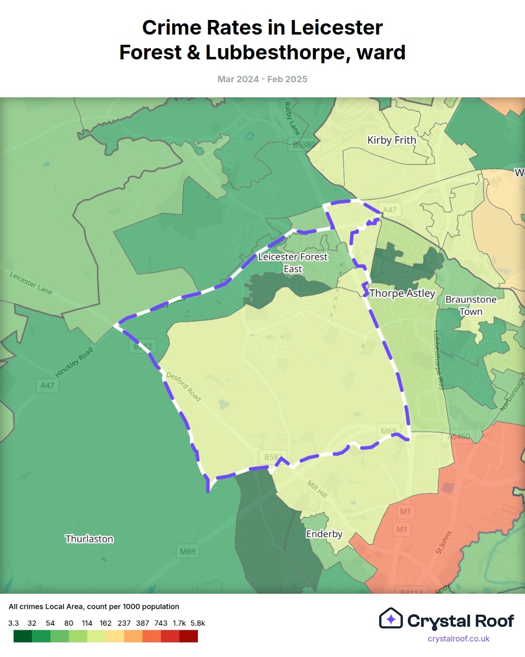 Leicester Forest & Lubbesthorpe, (ward) includes areas with the following crime ratings (see map):
