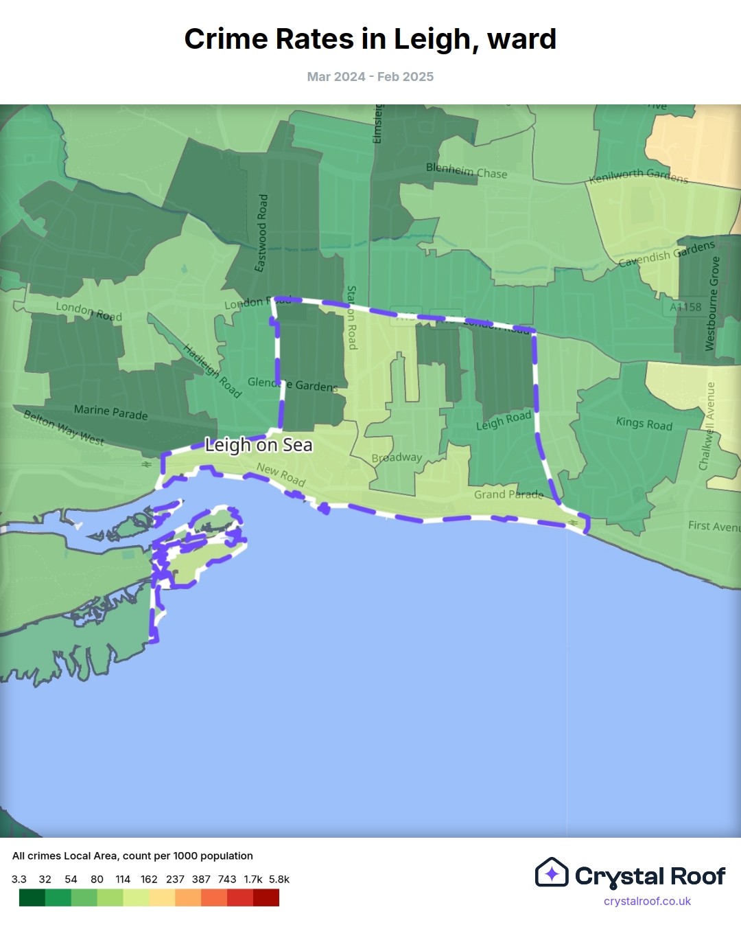 Leigh (ward) is located within Southend-on-Sea (borough). Annual total crime rate in Southend-on-Sea (borough) is 109 crimes per thousand resident population, which can be rated as 5 out of 10 or medium crime level compared to other local authority districts in England and Wales.