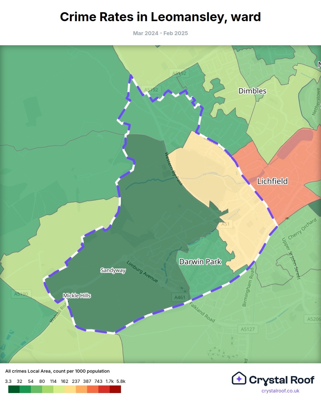 Leomansley (ward) is located within Lichfield (borough). Annual total crime rate in Lichfield (borough) is 66.4 crimes per thousand resident population, which can be rated as 2 out of 10 or low crime level compared to other local authority districts in England and Wales.