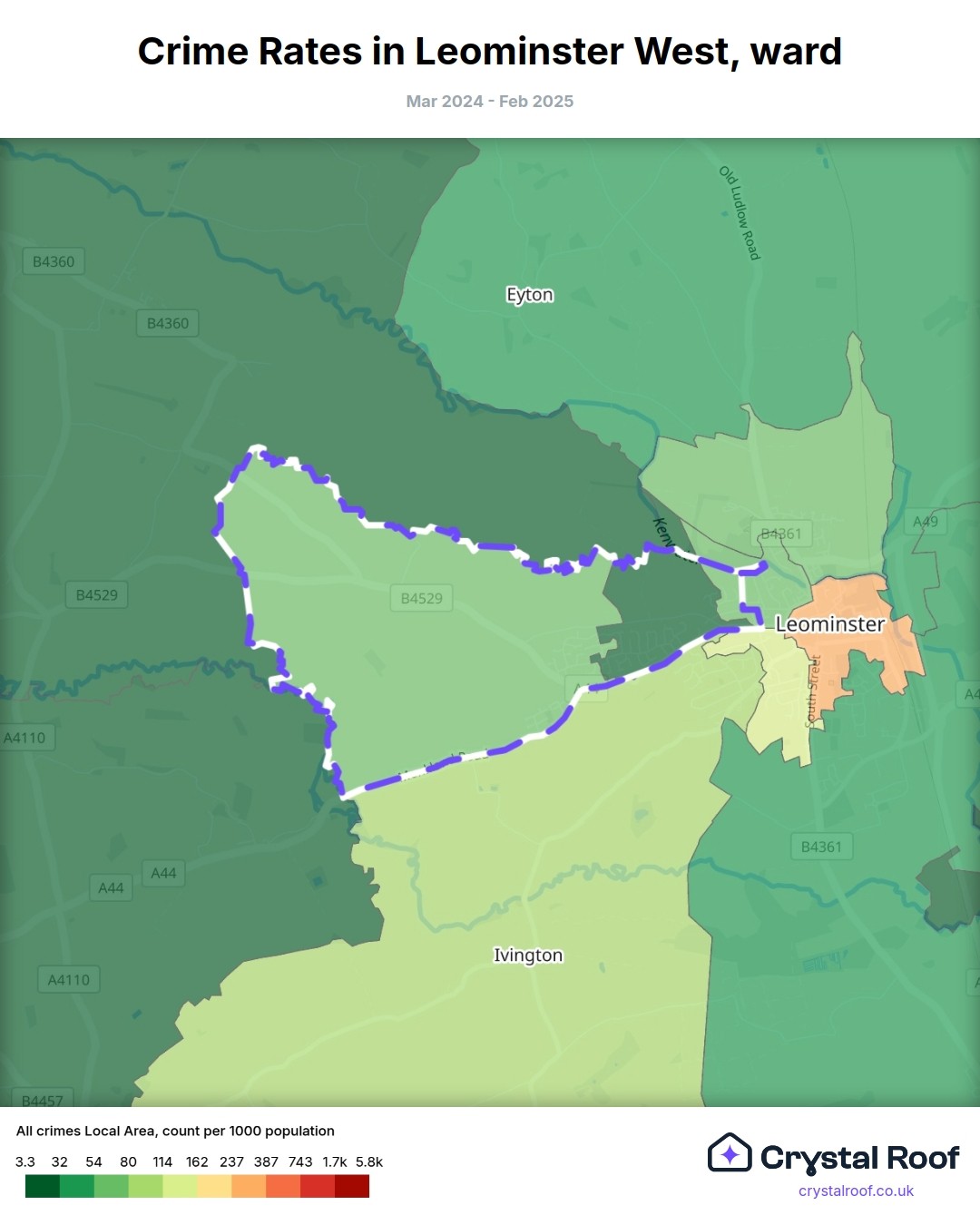 Leominster West, (ward) includes areas with the following crime ratings (see map):