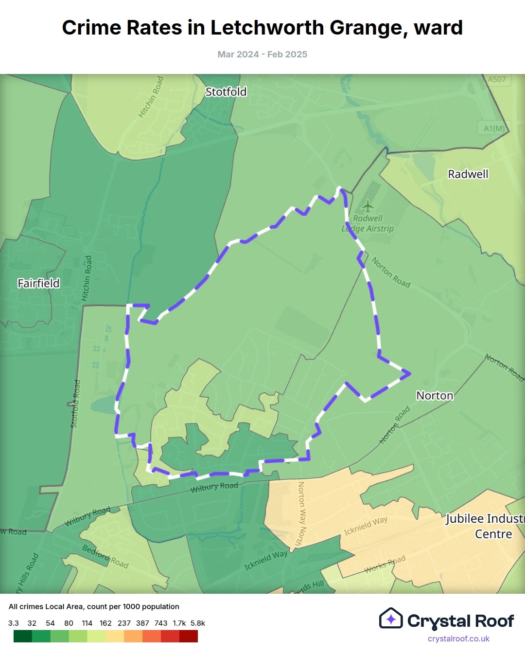 The figures in grey indicate the relative ratings of Letchworth Grange (ward) for a specific crime type compared to other wards in England and Wales.