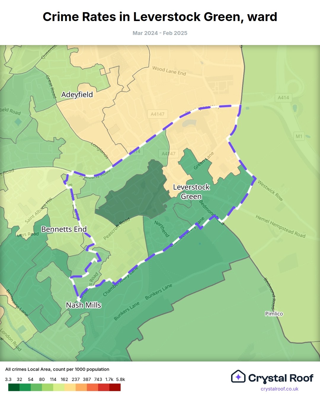 Leverstock Green, (ward) includes areas with the following crime ratings (see map):