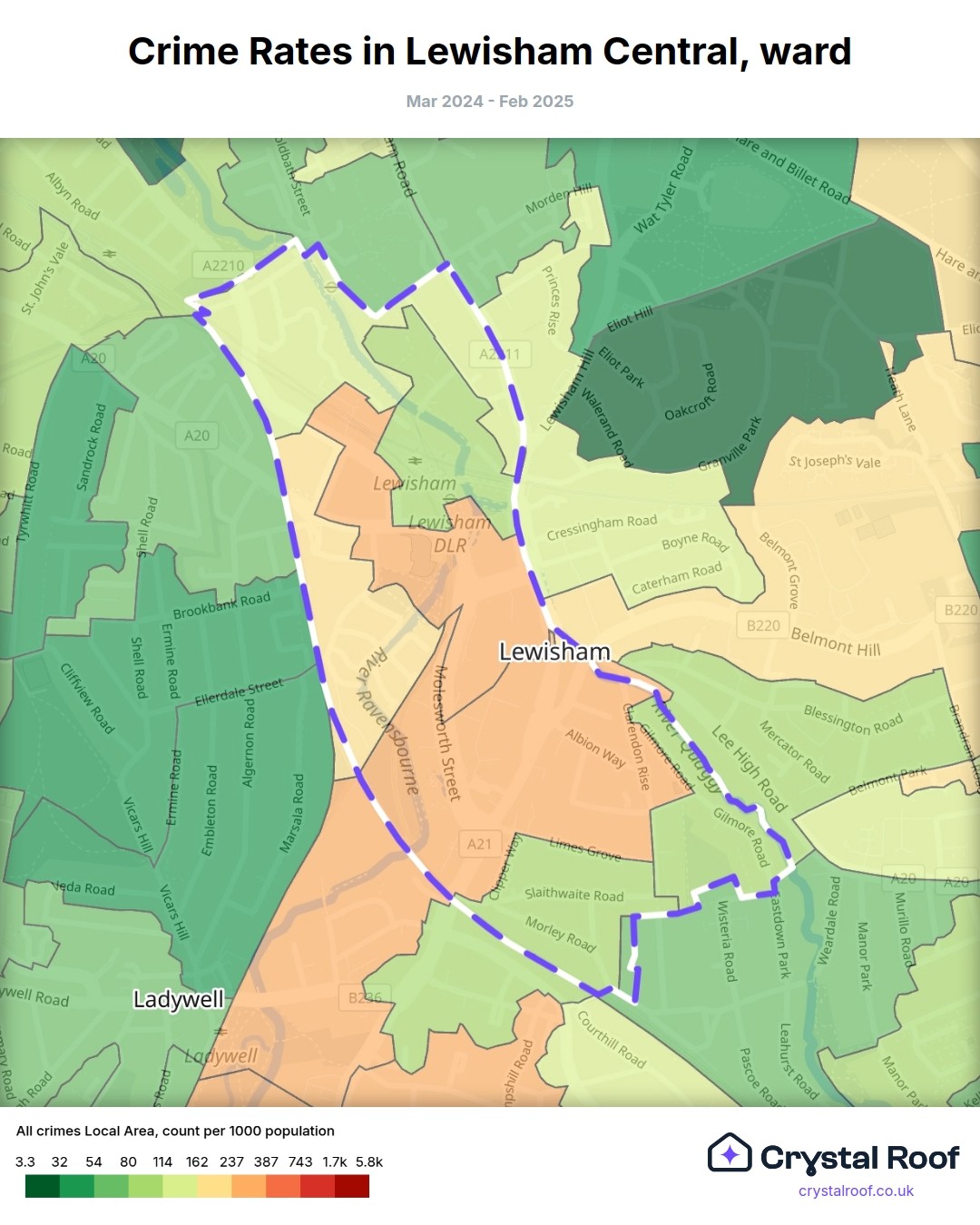 Lewisham Central, (ward) includes areas with the following crime ratings (see map):
