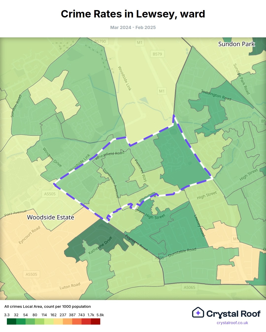 The figures in grey indicate the relative ratings of Lewsey (ward) for a specific crime type compared to other wards in England and Wales.