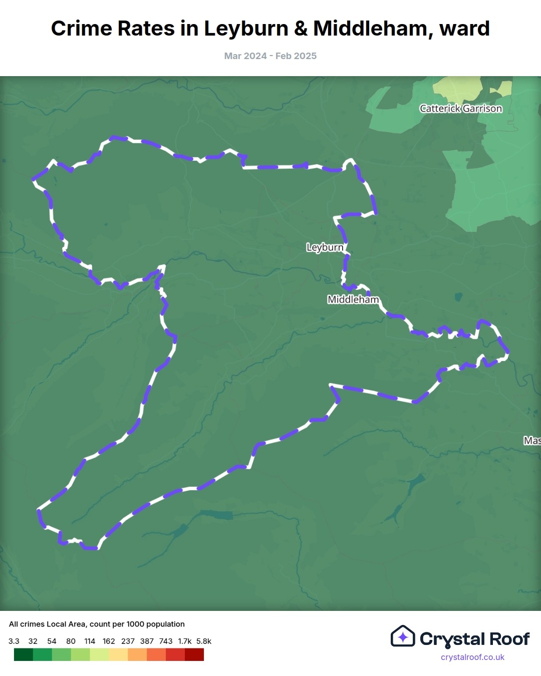 The figures in grey indicate the relative ratings of Leyburn & Middleham (ward) for a specific crime type compared to other wards in England and Wales.