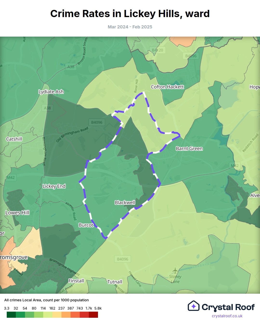Lickey Hills, (ward) includes areas with the following crime ratings (see map):